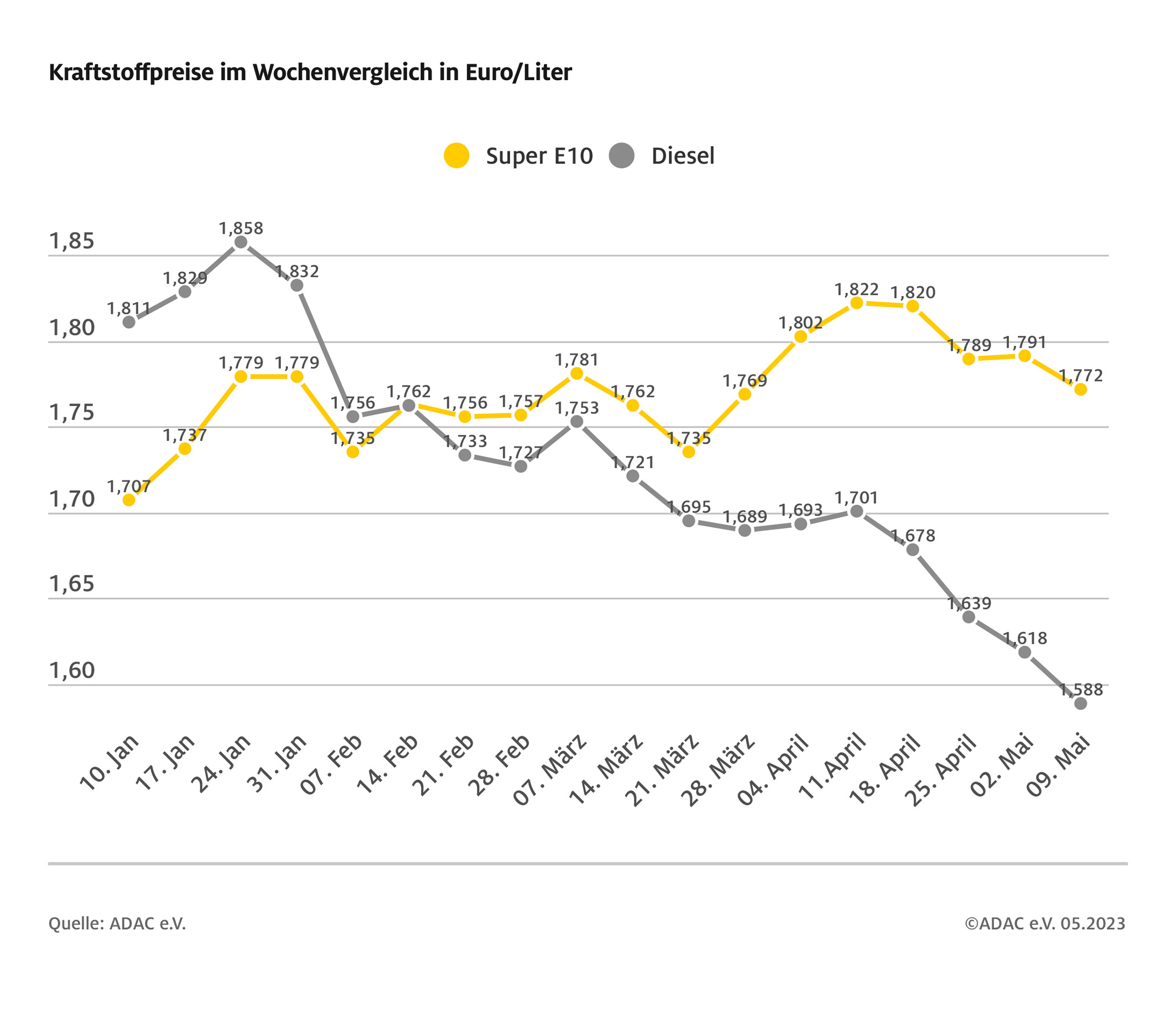 München (ots) – An den Zapfsäulen setzt sich die Entspannung weiter fort, die Preise beider Kraftstoffsorten sind im Vergleich zur Vorwoche erneut gesunken. Besonders deutlich hat – wie in den Vorwochen – der Preis für Diesel nachgegeben. Wie die aktuelle ADAC Auswertung der Kraftstoffpreise in Deutschland zeigt, kostet ein Liter Super E10 im bundesweiten Mittel 1,772 Euro, das sind 1,9 Cent weniger als in der vergangenen Woche. Diesel ist sogar um drei Cent günstiger und kostet aktuell im Schnitt 1,588 Euro.