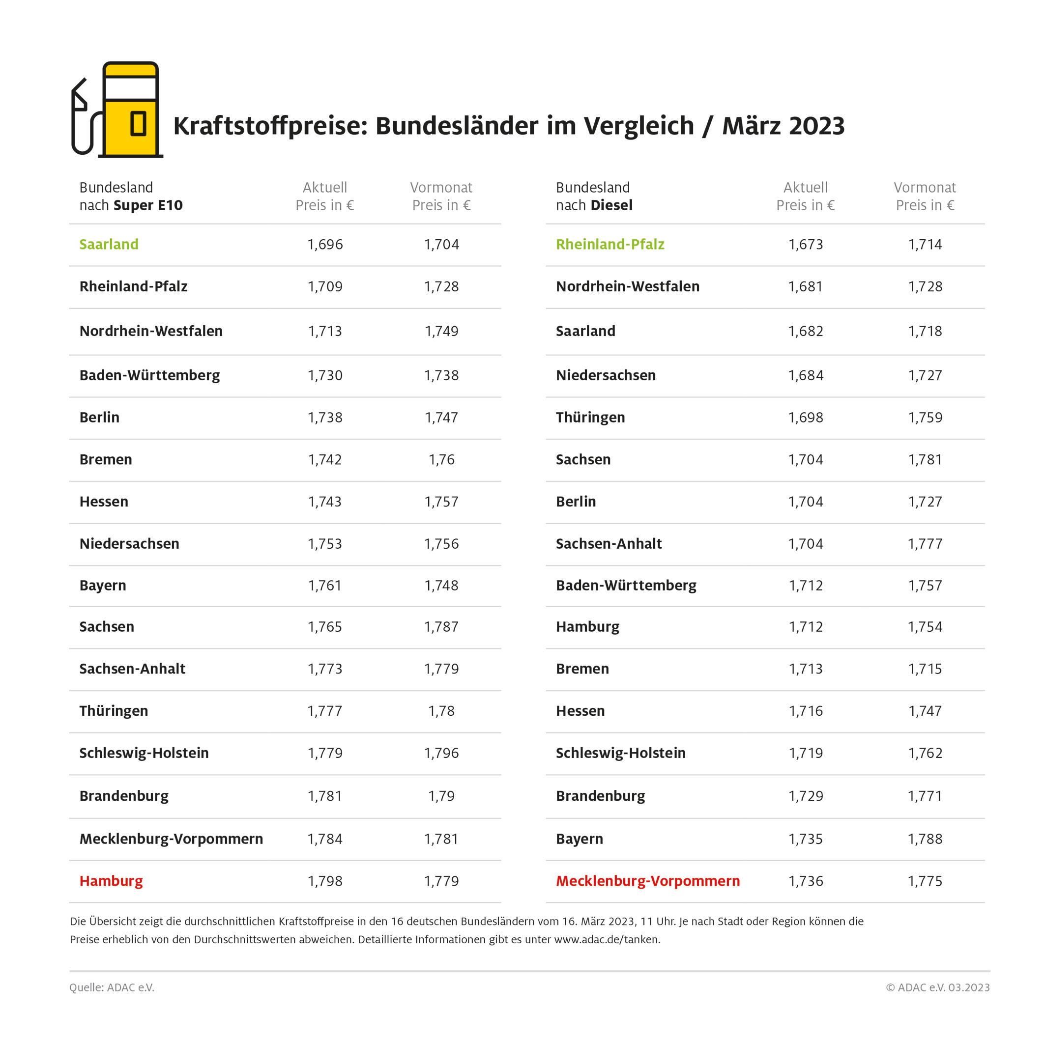 Benzin ist laut ADAC im Saarland am günstigsten, gefolgt von Rheinland-Pfalz auf Platz zwei. Im kleinsten Flächenland zahlt man für einen Liter Super E10 1,696 Euro und damit 10,2 Cent weniger als in Hamburg (1,798 Euro). Zweitteuerstes Bundesland ist Mecklenburg-Vorpommern mit einem Durchschnittspreis von 1,784 Euro.