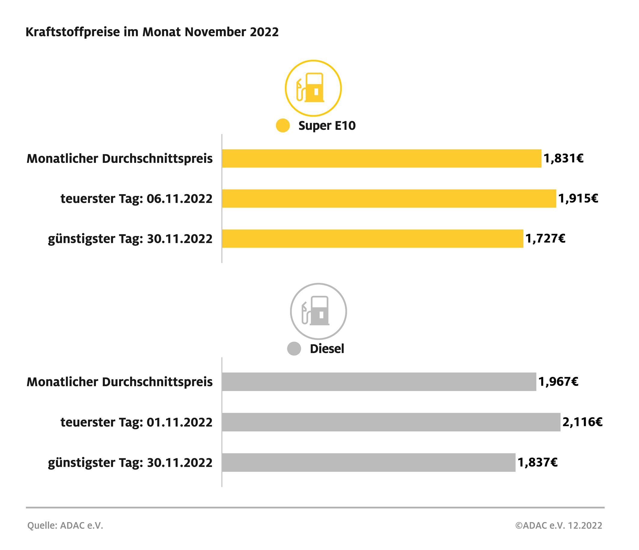 Auch bei Benzin brachte die Preisentwicklung laut ADAC im Monatsverlauf eine deutliche Entspannung. Kostete ein Liter Super E10 mit 1,915 Euro am 6. November am meisten, war der monatliche Tiefststand am 30. November mit 1,727 Euro erreicht – ein Rückgang von 18,8 Cent je Liter.