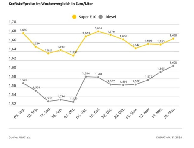 ADAC: Spritpreise geben etwas nach – Benzin im Vergleich zur Vorwoche um 1,3 Cent billiger, Diesel um 1,5 Cent