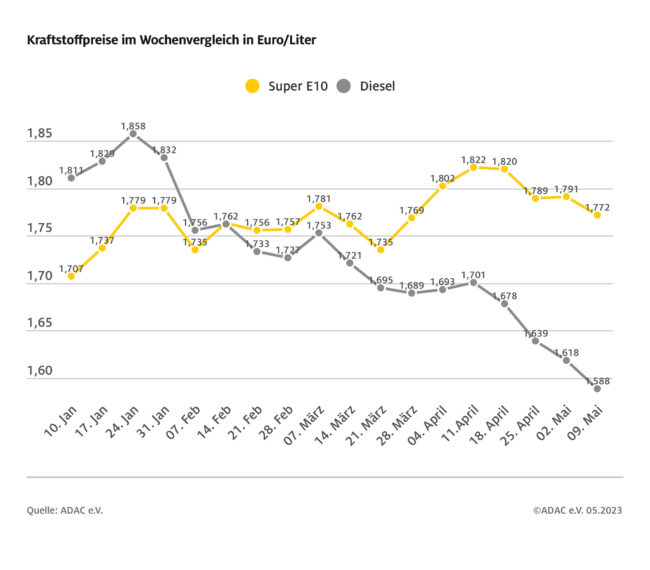 München (ots) – An den Zapfsäulen setzt sich die Entspannung weiter fort, die Preise beider Kraftstoffsorten sind im Vergleich zur Vorwoche erneut gesunken. Besonders deutlich hat – wie in den Vorwochen – der Preis für Diesel nachgegeben. Wie die aktuelle ADAC Auswertung der Kraftstoffpreise in Deutschland zeigt, kostet ein Liter Super E10 im bundesweiten Mittel 1,772…