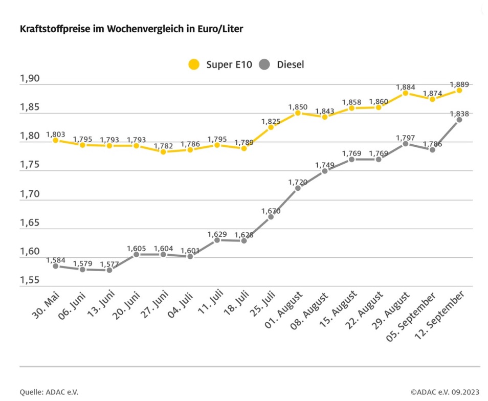 Der leichte Rückgang der Kraftstoffpreise in der Vorwoche war nicht mehr als eine kurze Verschnaufpause. Vor allem der Preis auf Diesel-Kraftstoff hat binnen einer Woche einen gewaltigen Sprung nach oben gemacht: Wie die aktuelle ADAC Auswertung der Kraftstoffpreise in Deutschland zeigt, kostet ein Liter Diesel im bundesweiten Mittel 1,838 Euro und damit 5,2 Cent mehr als in der Vorwoche. Benzin ist um 1,5 Cent teurer und kostet jetzt je Liter Super E10 im Schnitt 1,889 Euro.