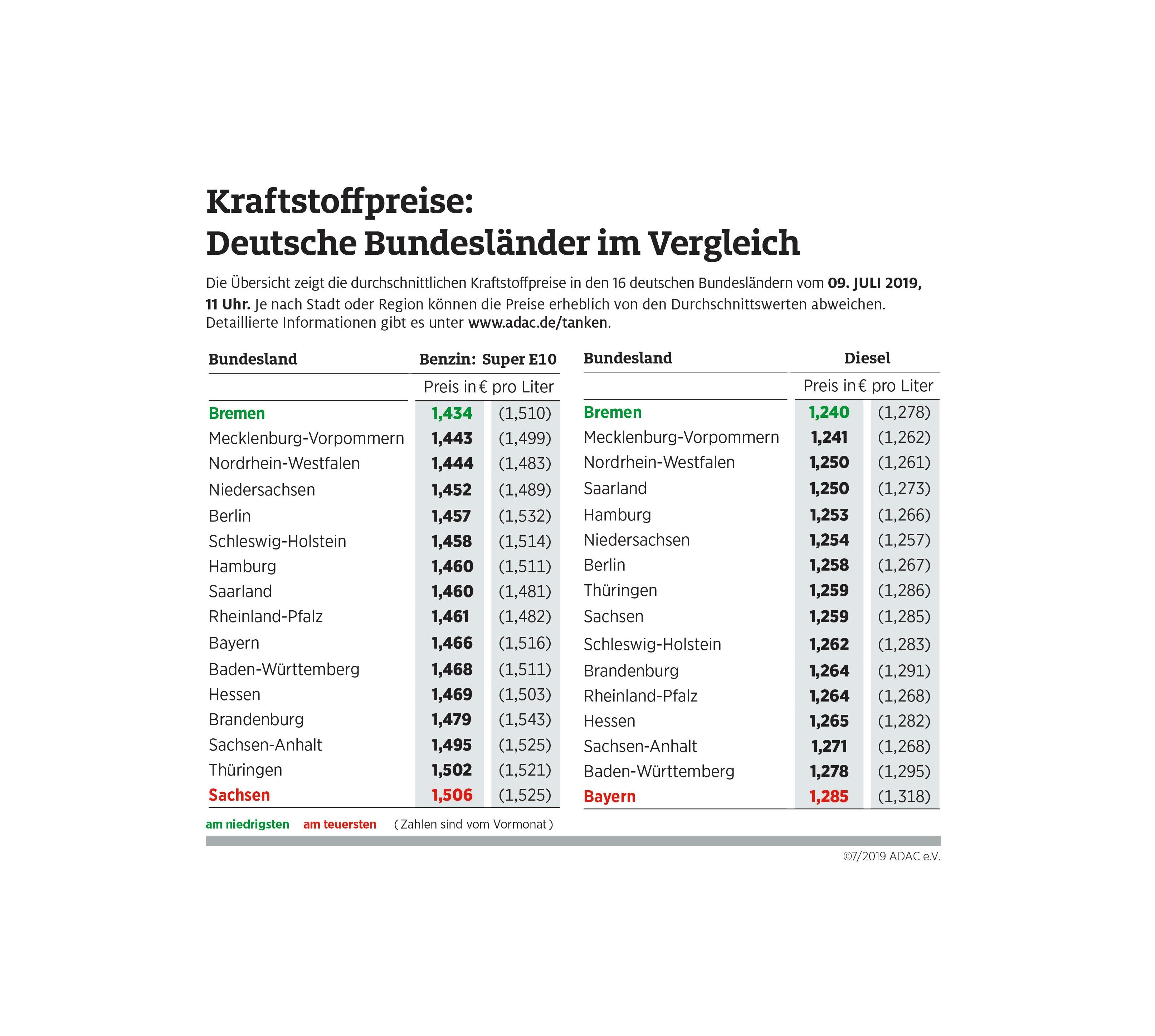 Die Durchschnittspreise für Benzin und Diesel in den Bundesländern weisen erkennbare Unterschiede auf. Am günstigsten tanken Autofahrer derzeit im Stadtstaat Bremen: Ein Liter Super E10 ist hier mit durchschnittlich 1,434 Euro um 7,2 Cent billiger als im teuersten Bundesland Sachsen (1,506 Euro). Ein Liter Diesel kostet in Bremen im Mittel 1,240 Euro und damit 4,5 Cent weniger als in Bayern, wo Autofahrer mit 1,285 Euro für diese Kraftstoffart am meisten bezahlen müssen.