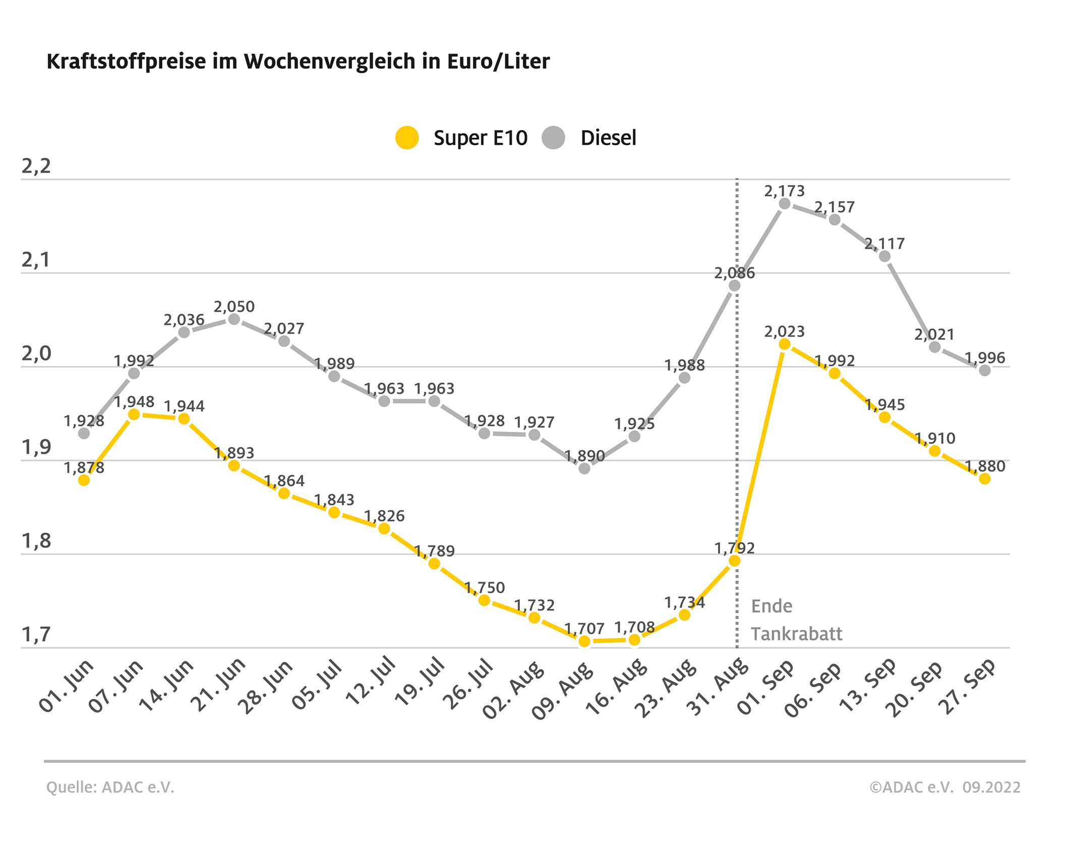 Erstmals seit fünf Wochen ist der Preis für Diesel-Kraftstoff wieder unter die Marke von zwei Euro gesunken. Wie die aktuelle ADAC Auswertung der Kraftstoffpreise in Deutschland zeigt, kostet ein Liter Diesel im bundesweiten Schnitt 1,996 Euro und damit 2,5 Cent weniger als vor einer Woche. Zuletzt lag der Diesel-Preis am 23. August mit 1,988 Euro je Liter unter der Zwei-Euro-Marke, damals aber noch unter den Bedingungen des Tankrabatts mit einem steuerlichen Abschlag von rund 17 Cent. Der Tankrabatt wurde planmäßig am 31. August beendet.