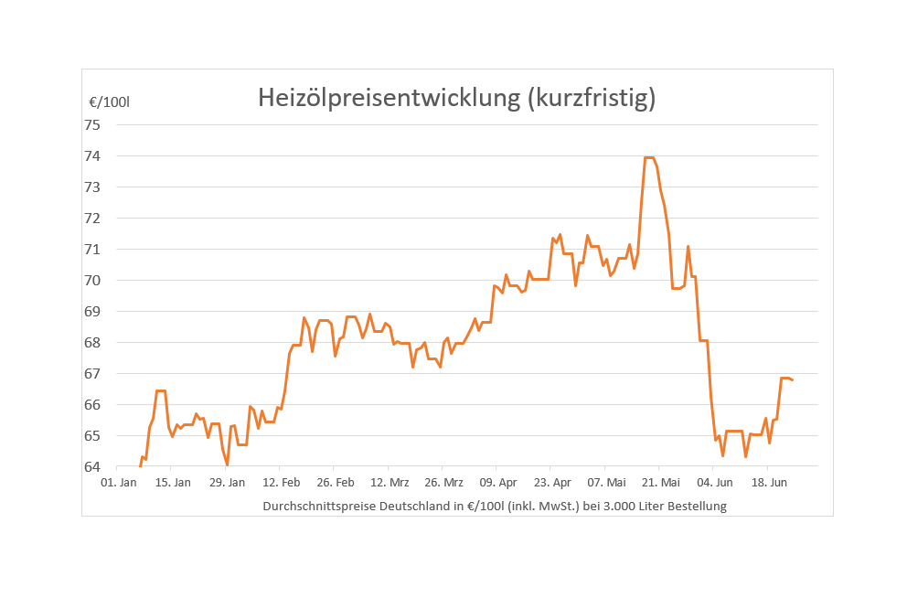 Hinweis: Die genannten Heizölpreise beziehen sich stets auf den deutschlandweiten Durchschnittspreis bei einer Bestellung von 3.000 Liter Heizöl Standard schwefelarm inklusive 19% MwSt.. Durch Transportkosten fallen die Preise regional jedoch unterschiedlich aus. Die Preisspanne zwischen den Regionen kann daher momentan bei bis zu ca. 6,18 Euro pro 100 Liter liegen. Stand der Preise: 24.06.2019