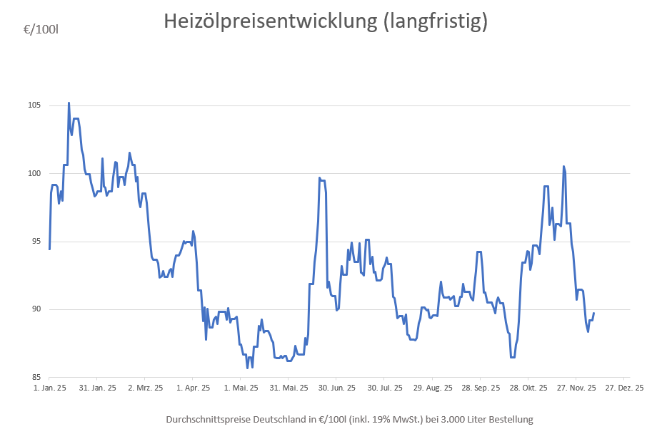 Die genannten Heizölpreise beziehen sich stets auf den deutschlandweiten Durchschnittspreis bei einer Bestellung von 3.000 Liter Heizöl Standard schwefelarm inklusive 19% MwSt. Außerdem fallen durch Transportkosten die Preise regional unterschiedlich aus. Stand der Preise 29.12.2025