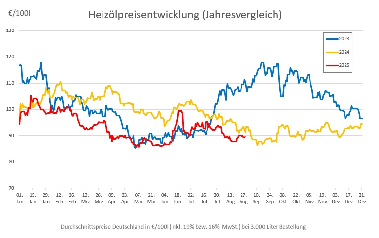 Die genannten Heizölpreise beziehen sich stets auf den deutschlandweiten Durchschnittspreis bei einer Bestellung von 3.000 Liter Heizöl Standard schwefelarm inklusive 19% MwSt. Außerdem fallen durch Transportkosten die Preise regional unterschiedlich aus. Stand der Preise 29.08.2025