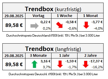 Die genannten Heizölpreise beziehen sich stets auf den deutschlandweiten Durchschnittspreis bei einer Bestellung von 3.000 Liter Heizöl Standard schwefelarm inklusive 19% MwSt. Außerdem fallen durch Transportkosten die Preise regional unterschiedlich aus. Stand der Preise 29.08.2025