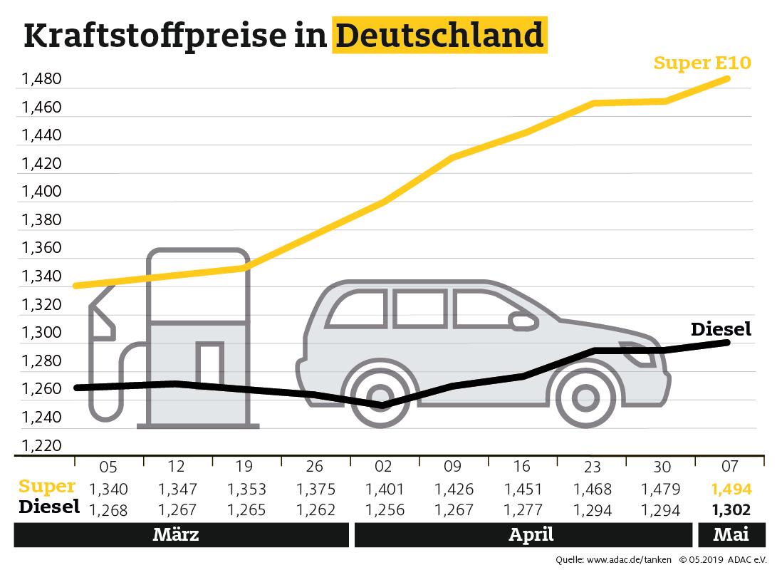 In der ersten Maiwoche haben die Spritpreise weiter angezogen. Laut aktueller Auswertung des ADAC müssen Autofahrer für einen Liter Super E10 im Bundesdurchschnitt 1,494 Euro bezahlen, das sind 1,5 Cent mehr als in der Vorwoche. Diesel verteuerte sich um 0,8 Cent auf 1,302 Euro je Liter. Für Benzin ist es im Wochenvergleich bereits der neunte Anstieg in Folge. Die mittlere Preisdifferenz zwischen beiden Kraftstoffsorten, die im Februar zeitweise bei nur 7 Cent pro Liter lag, hat sich inzwischen auf 19,2 Cent vergrößert.