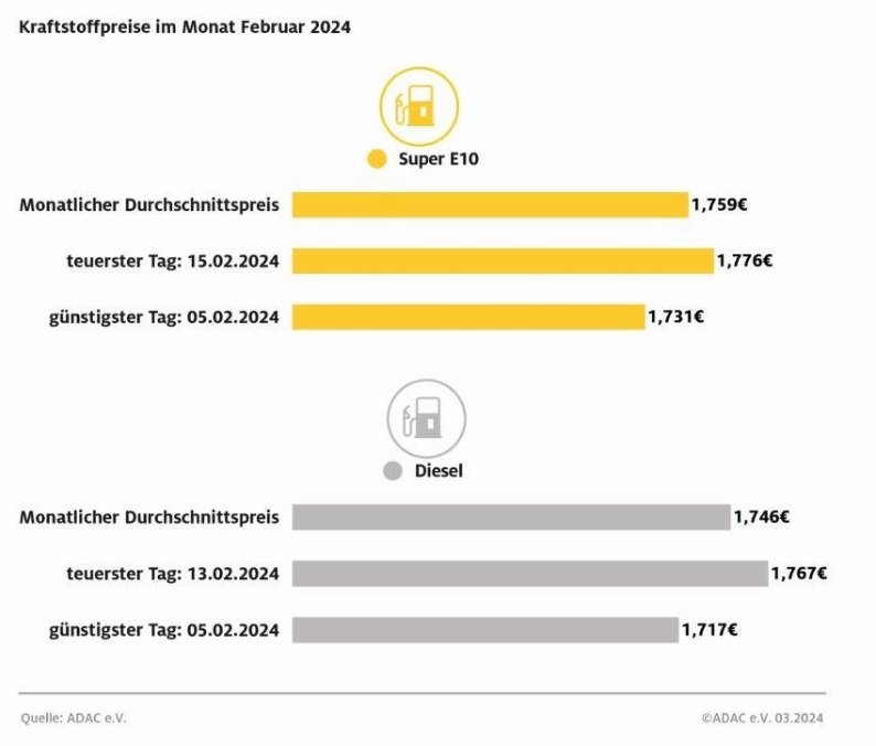 Die Autofahrerinnen und Autofahrer mussten im Februar 2024 spürbar mehr beim Tanken bezahlen als im Januar. Ein Liter Benzin war um 2,7 Cent teurer, ein Liter Diesel sogar um vier Cent. Das zeigt die monatliche ADAC Auswertung der Kraftstoffpreise in Deutschland. Danach kostete ein Liter Super E10 im Februar im Durchschnitt 1,759 Euro.